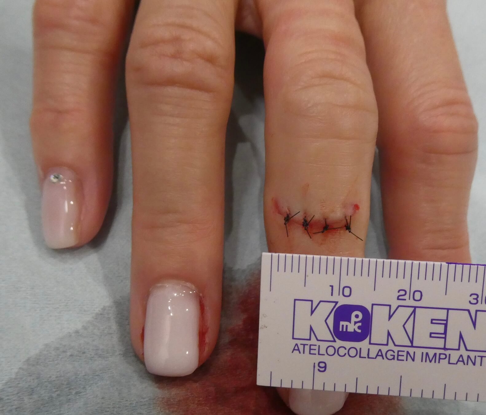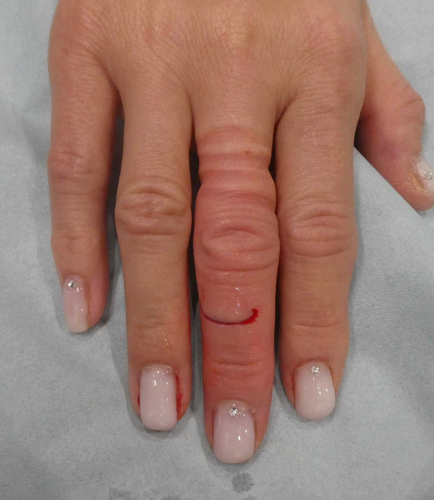 こちらは成人の方で、割れたガラスの先で右第三指を切ってしまった方です。